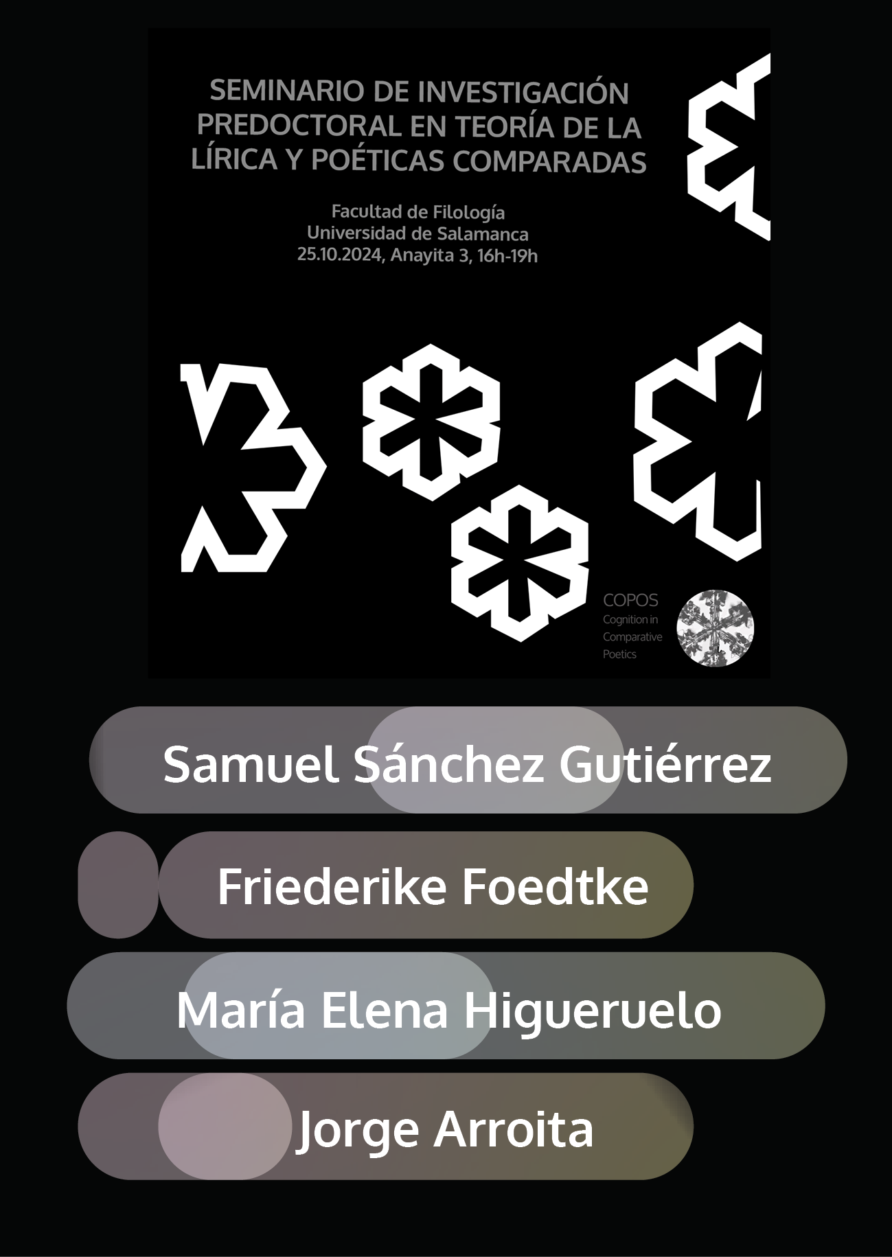 Área de Teoría de la Literatura y Literatura Comparada, Departamento de Lengua Española, Facultad de Filología, Universidad de Salamanca. 11.10.2024. Anayita 3, 16h-19h.